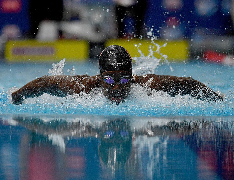 INDIANAPOLIS, IN – MAY 17: Simone Manuel competes in the women’s 100 meter butterfly race during the TYR Pro Swim Series at Indiana University Natatorium on May 17, 2018 in Indianapolis, Indiana. (Photo by Bobby Ellis/Getty Images)