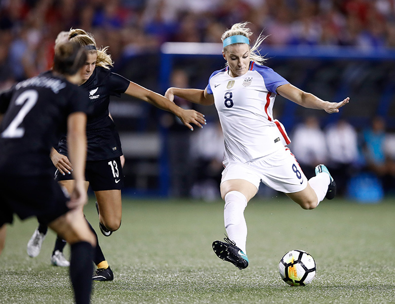 CINCINNATI, OH – SEPTEMBER 19: Julie Ertz #8 of the USA kicks the ball in the match against New Zealand at Nippert Stadium on September 19, 2017 in Cincinnati, Ohio. The USA won 5-0 in the international friendly match. (Photo by Andy Lyons/Getty Images)